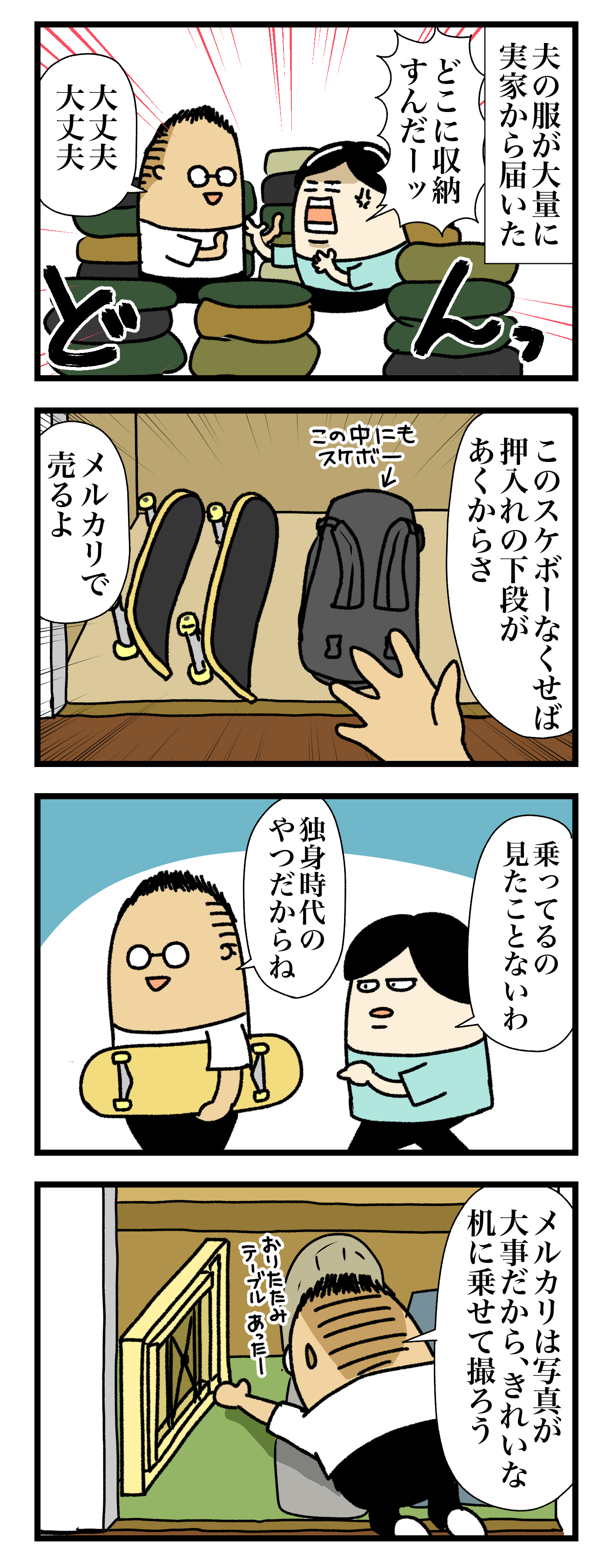 2023年12月10日 「メルカリで売るから!」を信じた結果 これの直後の話です そして現在も居間にスケボーとテーブルが鎮座している…もはや定位置と化してきている。まぁ、言うて私もメルカリで売る売るって言ってる秋冬用の靴まだ写真すら撮ってないんですけどね。もう3年くらい経つよ…靴売る時って靴底きれいにしたり、ワイズとか調べたり色々めんどくさそうで…(まだ靴を出品したことない)そもそもどんな梱包したらいいのかもわからない…年内には2人ともなんとか売りたいです。 スポンサードリンク 「日常」カテゴリの最新記事