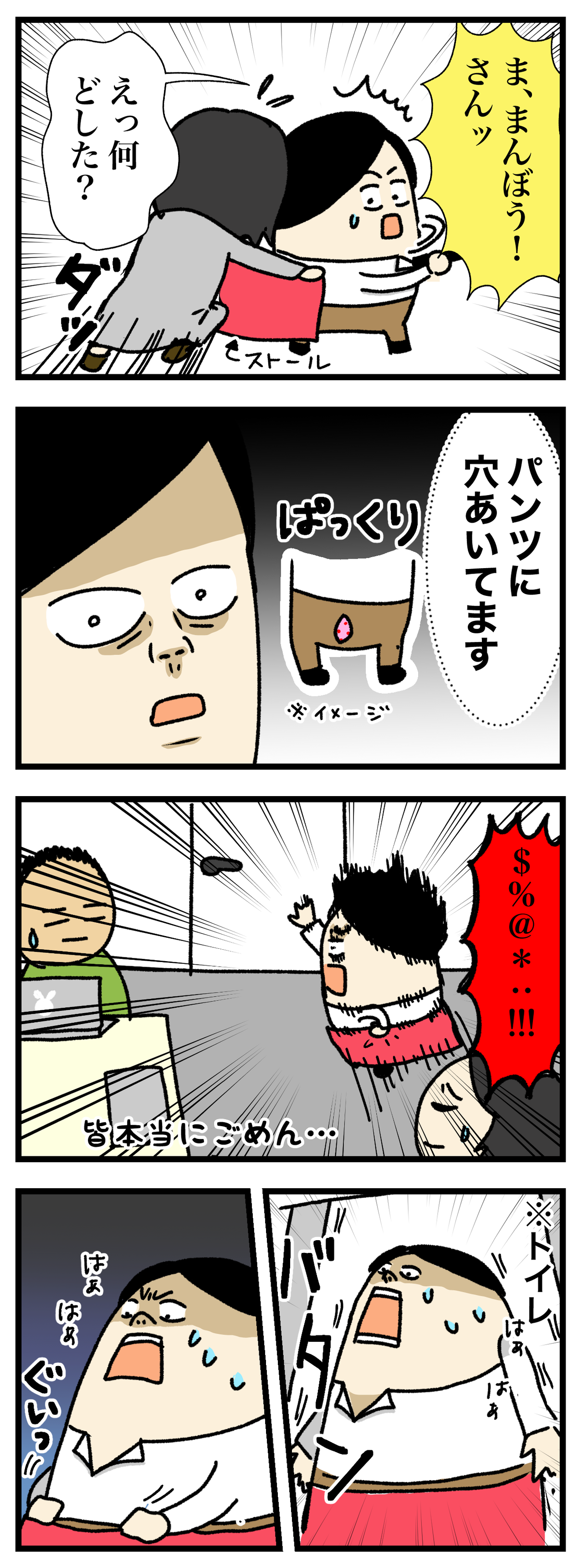 お店の人に「こいつ、尻んとこパックリいったんか…www」って