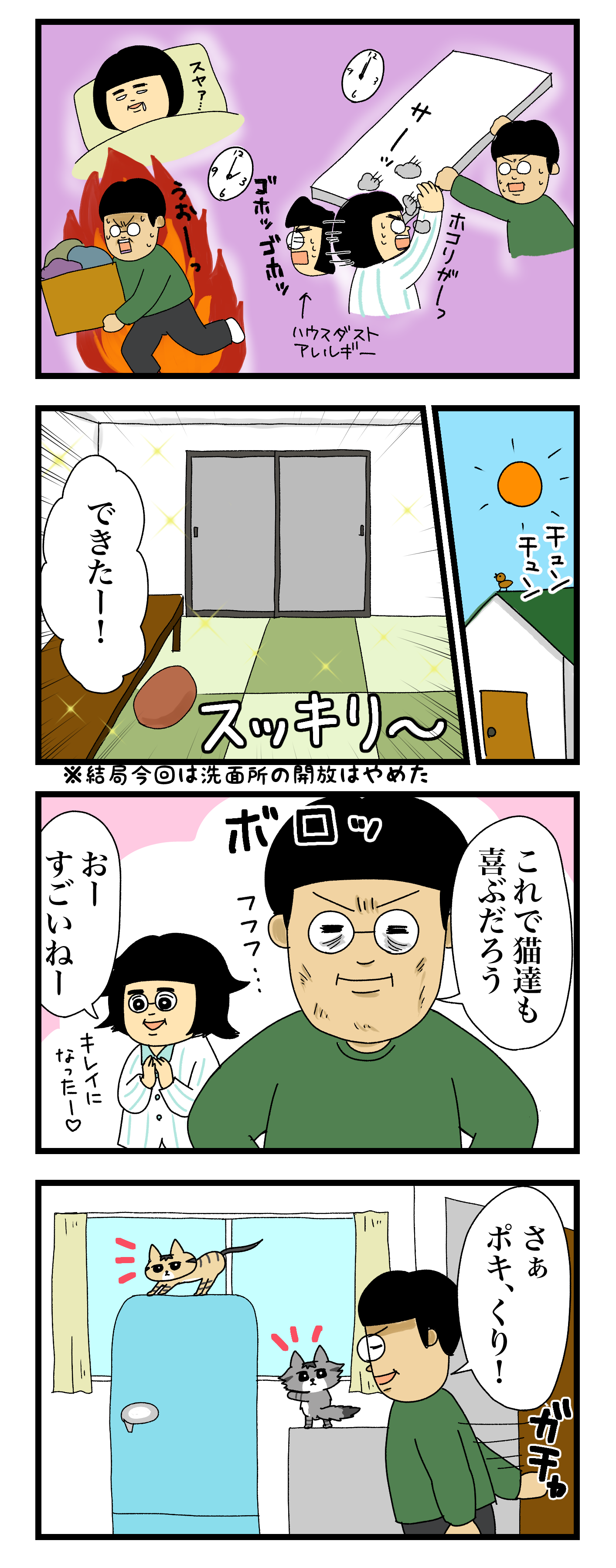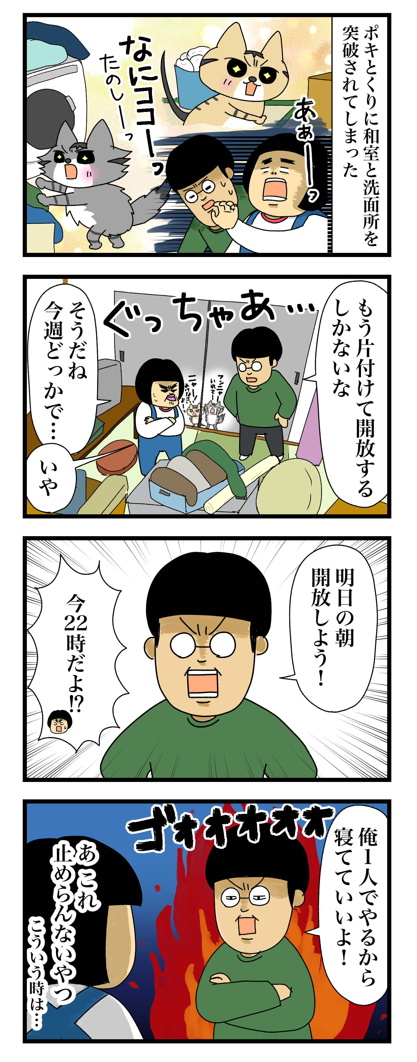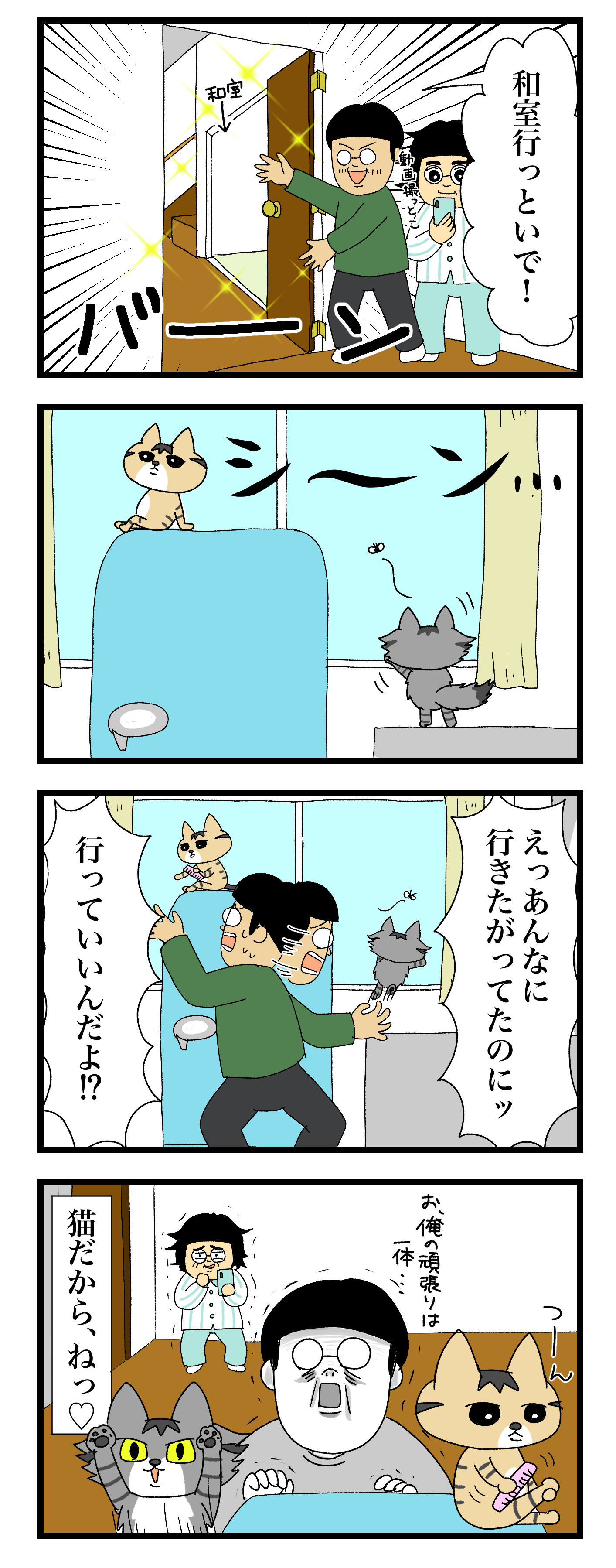 2024年06月02日 猫飼い、下僕への道始まる こちらの後日談です このあと3回目の声かけでやっと行った。行ったあと、2匹はめっちゃ楽しそうに和室を探検してたので、夫たろさんの努力は無事報われたのでした。たろさん、スイッチ入ると止められない日常漫画と猫漫画を描いています。ポチッと押して頂けると狂喜乱舞します!